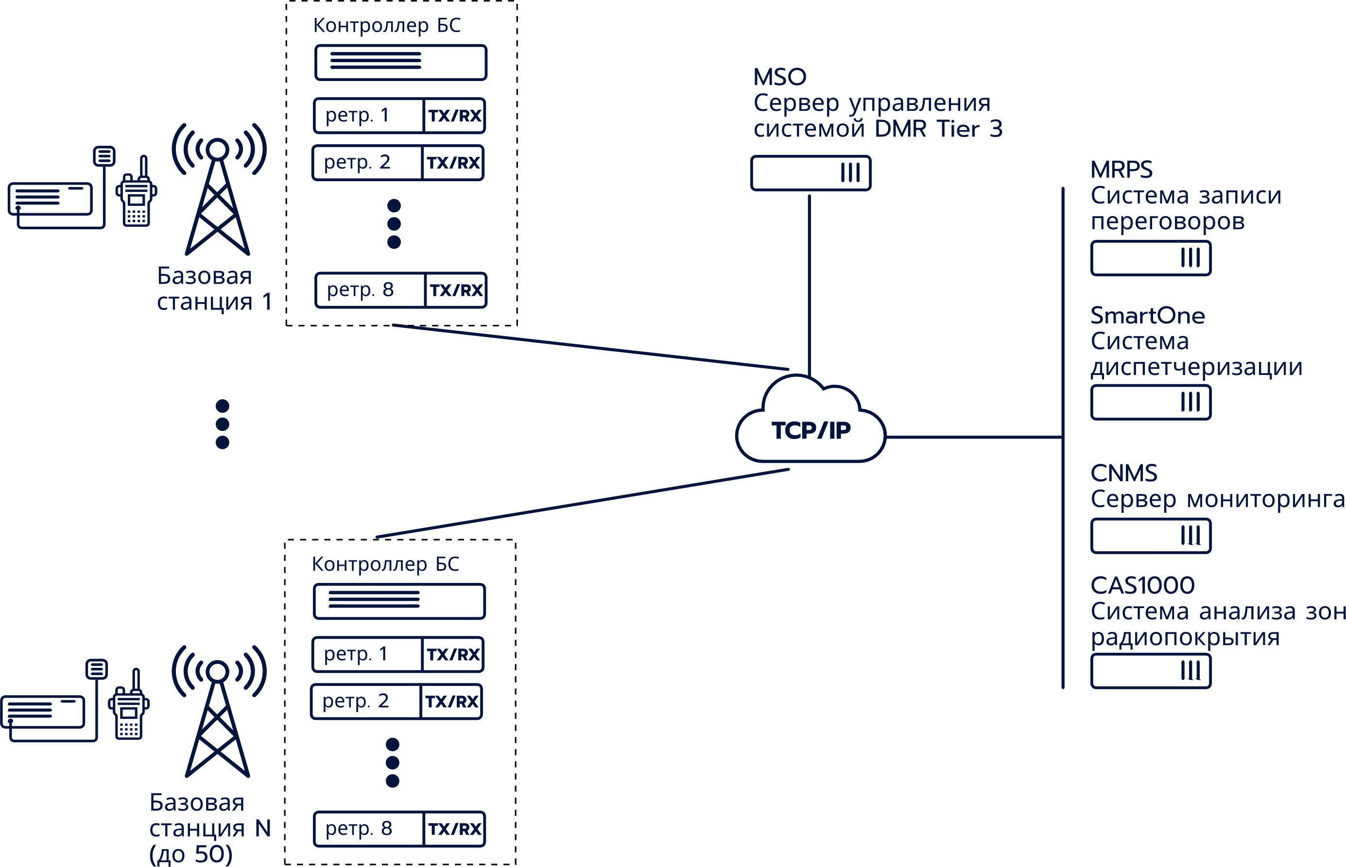 Полномасштабная транкинговая система с централизованной архитектурой и выделенным каналом управления. Полностью соответствует открытому стандарту DMR Tier 3.